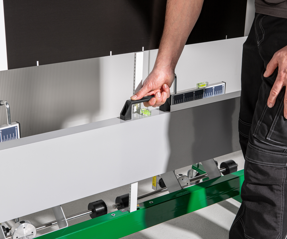- A vertical sliding cross beam for infinite and simple height adjustments, with integrated mirrors for increased accuracy and protection